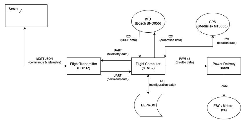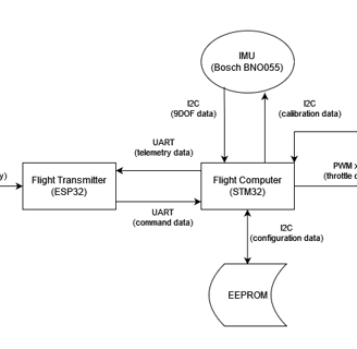 Flight Computer: I chose UART for intercommunication between the flight computer and transmitter because of its reliability in noisy environments. Protocols like SPI or I2C relay on clock signals, and can be disrupted by high inductive noise generated by the drones motors, leading to data loss. However, compared to clock based protocols UART has a much lower data transfer rate and overall transfer speed. This means that it will take more clock cycles to send the same data packet over UART verses I2C or SPI. To mitigate this, I implemented DMA (Direct Memory Access), allowing the STM32 to offload data transfer tasks to a dedicated memory controller. This ensures the flight computer remains updated with command data. The flight transmitter will toggle a pin to high, indicating to the flight computer that a command is ready to be read.