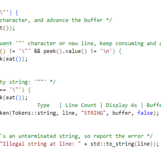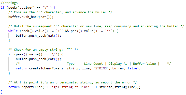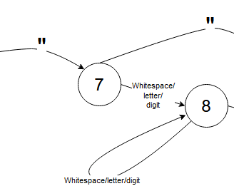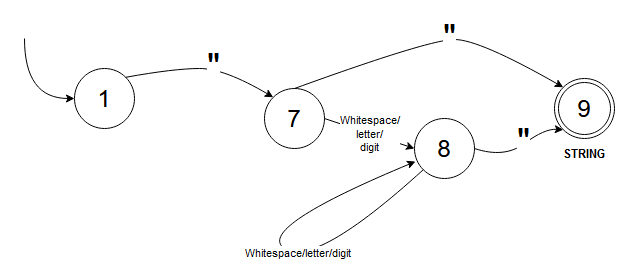 This is the starting point of a compiler. It evaluates a buffer of characters, and uses regular expressions to produce lexemes (tokens) based on the keywords and identifiers. Below is the state diagram and subsequent logic for detecting a string.